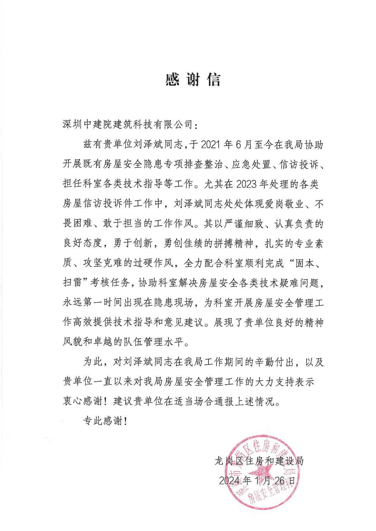 近期,深圳中建院建筑科技有限公司(以下簡稱“深圳中建院”)收到深圳市龍崗區住房和建設局發來的感謝信,對深圳中建院多年來在房屋安全管理工作中的大力支持表示感謝,對劉澤斌、陳思凝兩位同志的辛勤付出提出表揚。