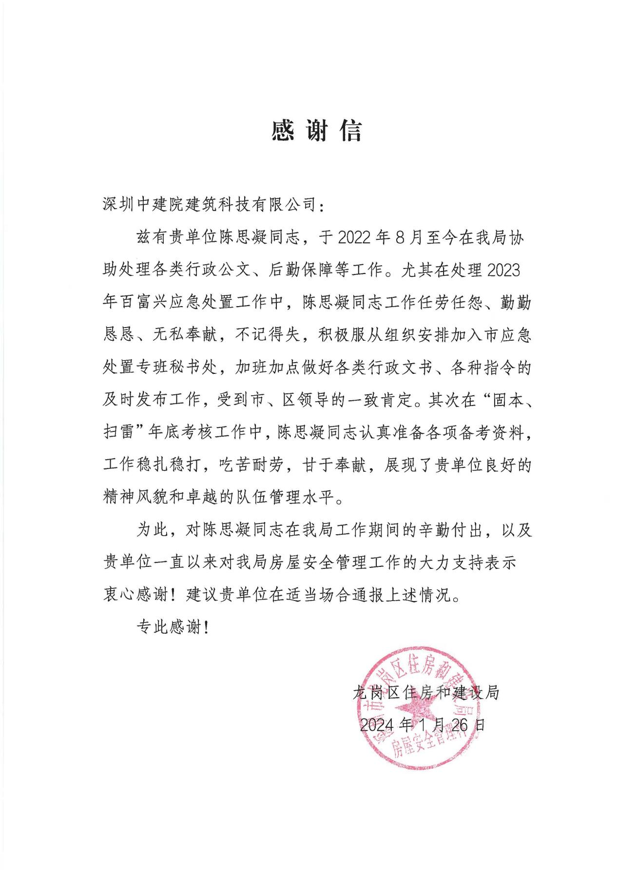 深圳中建院收到深圳市龍崗區住房和建設局感謝信