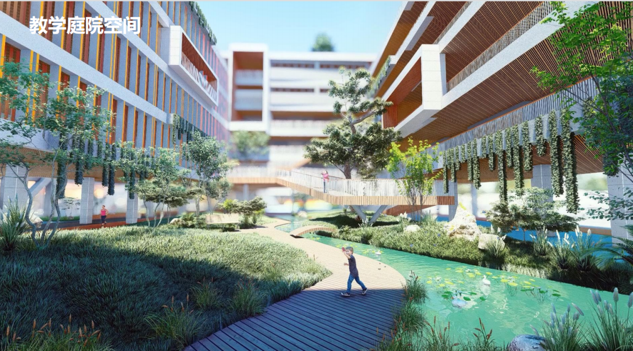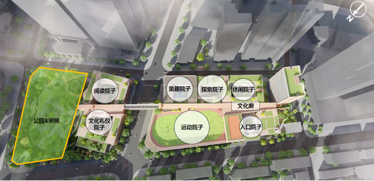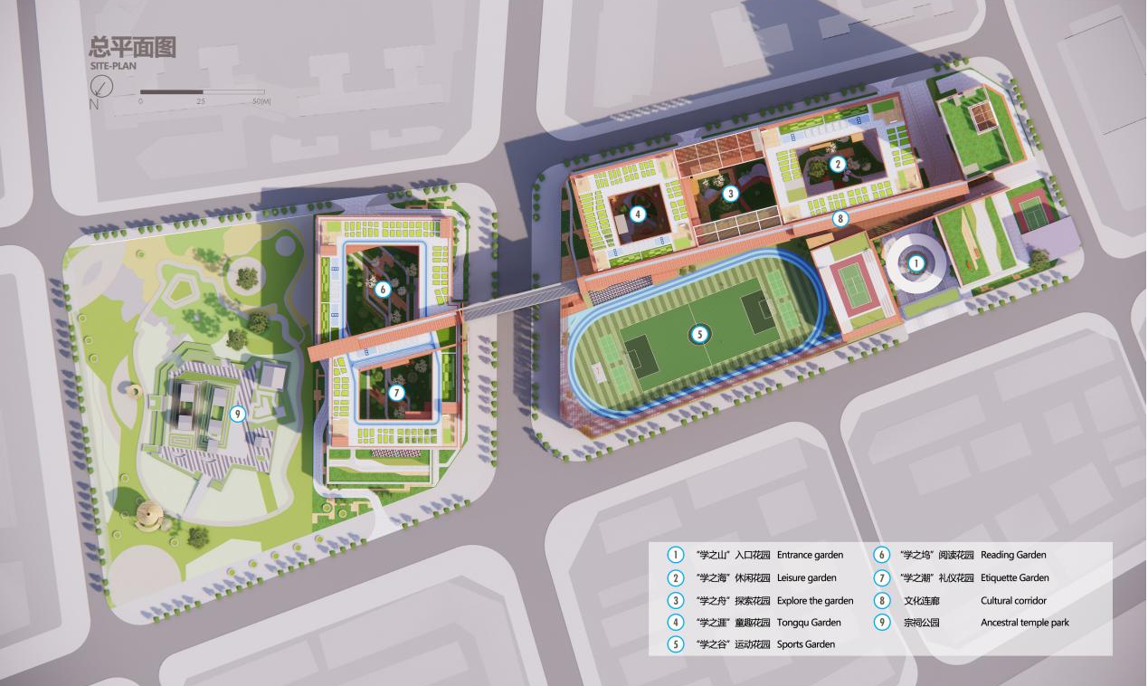 設計秉承 “讓每一個學生成為學習的主體”的理念,用一條“文化廊”串聯“七個教育院子”, 并與宗祠、公園相連,與周邊環境積極互動。在多個設計維度適應未來教育的“校園模式”“社群概念”“成長空間”“復合共享”“綠色生態”“自然藝術”“文體健康”“鏈接社區”“快速建造”“成本控制”“持續運營”。