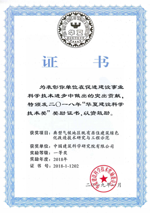 中國建筑科學研究院有限公司深圳分公司與上海市建筑科學研究院(集團)有限公司、哈爾濱工業(yè)大學共同完成的“十二五”國家科技支撐計劃課題《典型氣候地區(qū)既有居住建筑綠色化改造技術研究與工程示范》榮獲2018年華夏建設科學技術獎一等獎。