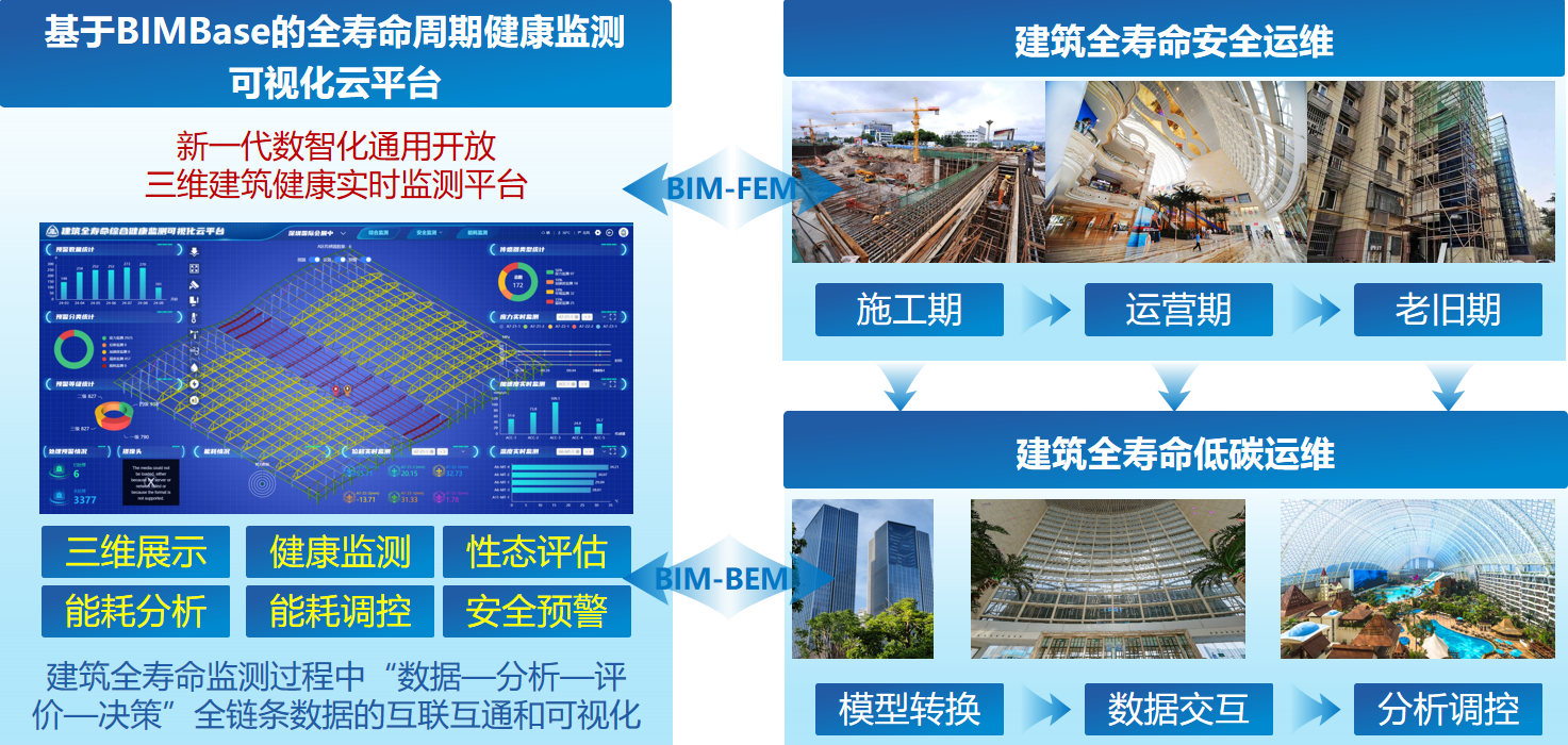 ??“建筑安全與能耗數(shù)字化集成監(jiān)測關(guān)鍵技術(shù)”科技成果針對現(xiàn)階段建筑安全及能耗整體綜合性能狀態(tài)的分析、理解、預(yù)警難度大,結(jié)構(gòu)安全與建筑能耗運維效率低下,海量建筑數(shù)字信息安全可控能力差的突出問題,面向我國“數(shù)字住建”建設(shè)發(fā)展目標(biāo),積極響應(yīng)數(shù)字化轉(zhuǎn)型背景下建筑全壽命周期內(nèi)健康與綠色運維的重大需求,搭建了基于國產(chǎn)自主知識產(chǎn)權(quán)BIMBase的建筑全壽命周期健康監(jiān)測可視化云平臺,提出了建筑圍護(hù)結(jié)構(gòu)與主體結(jié)構(gòu)關(guān)聯(lián)性分析與一體化監(jiān)測技術(shù),開發(fā)了建筑在實際運行邊界條件下的最優(yōu)能效仿真平臺,研制了基于BIMBase平臺的建筑信息模型到建筑能耗模型的高效轉(zhuǎn)換工具,形成了建筑安全與能耗數(shù)字化集成監(jiān)測成套關(guān)鍵技術(shù)體系,增強了專業(yè)領(lǐng)域核心競爭力。